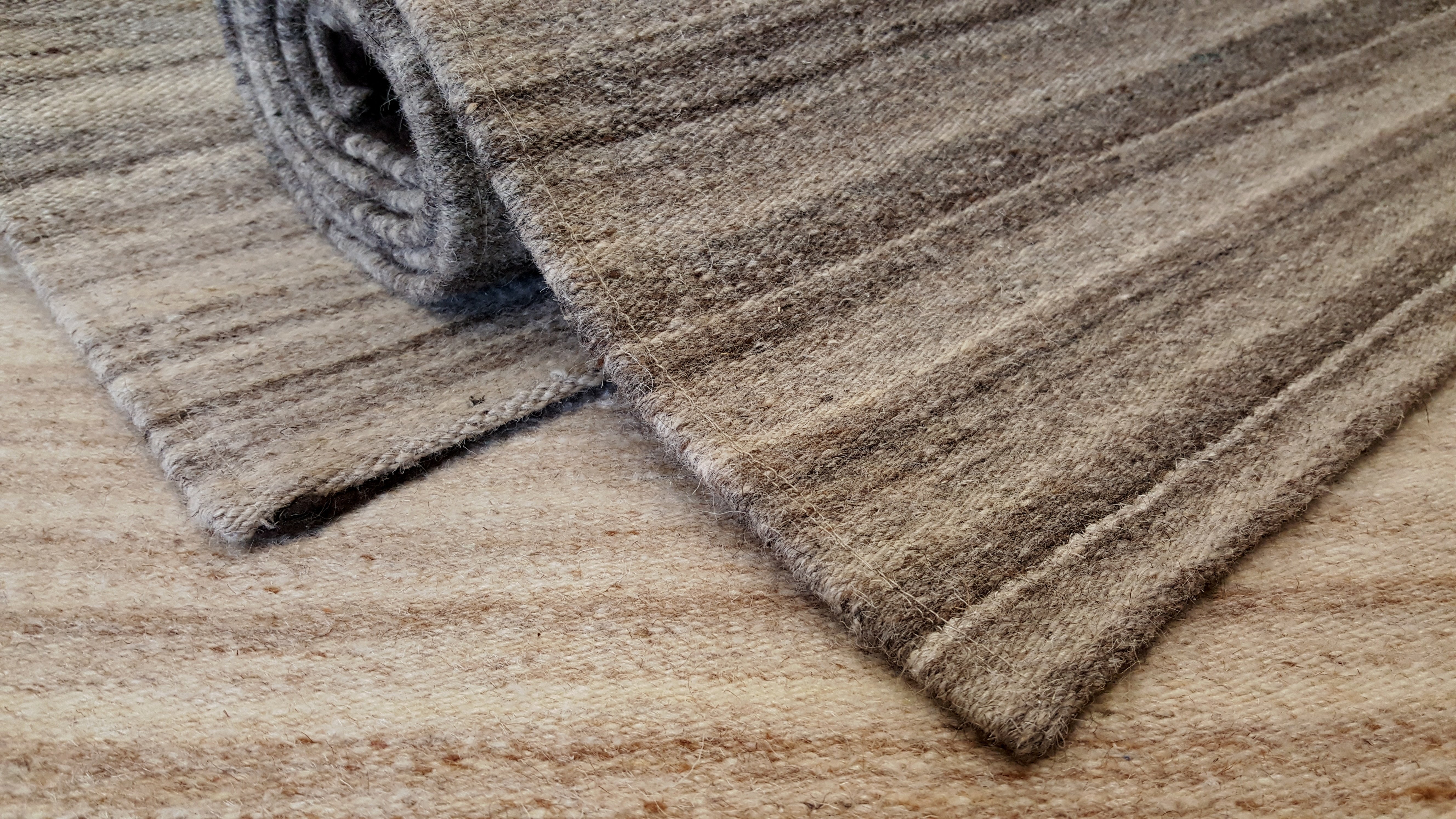 Contrasting colours in the weaves of Artisan wool Nirvana Snow and Nirvana Threadbo. The contemporary flat woven wool piles of Nirvana rugs have a deep, tight loop pile woven to give a pebble like texture.