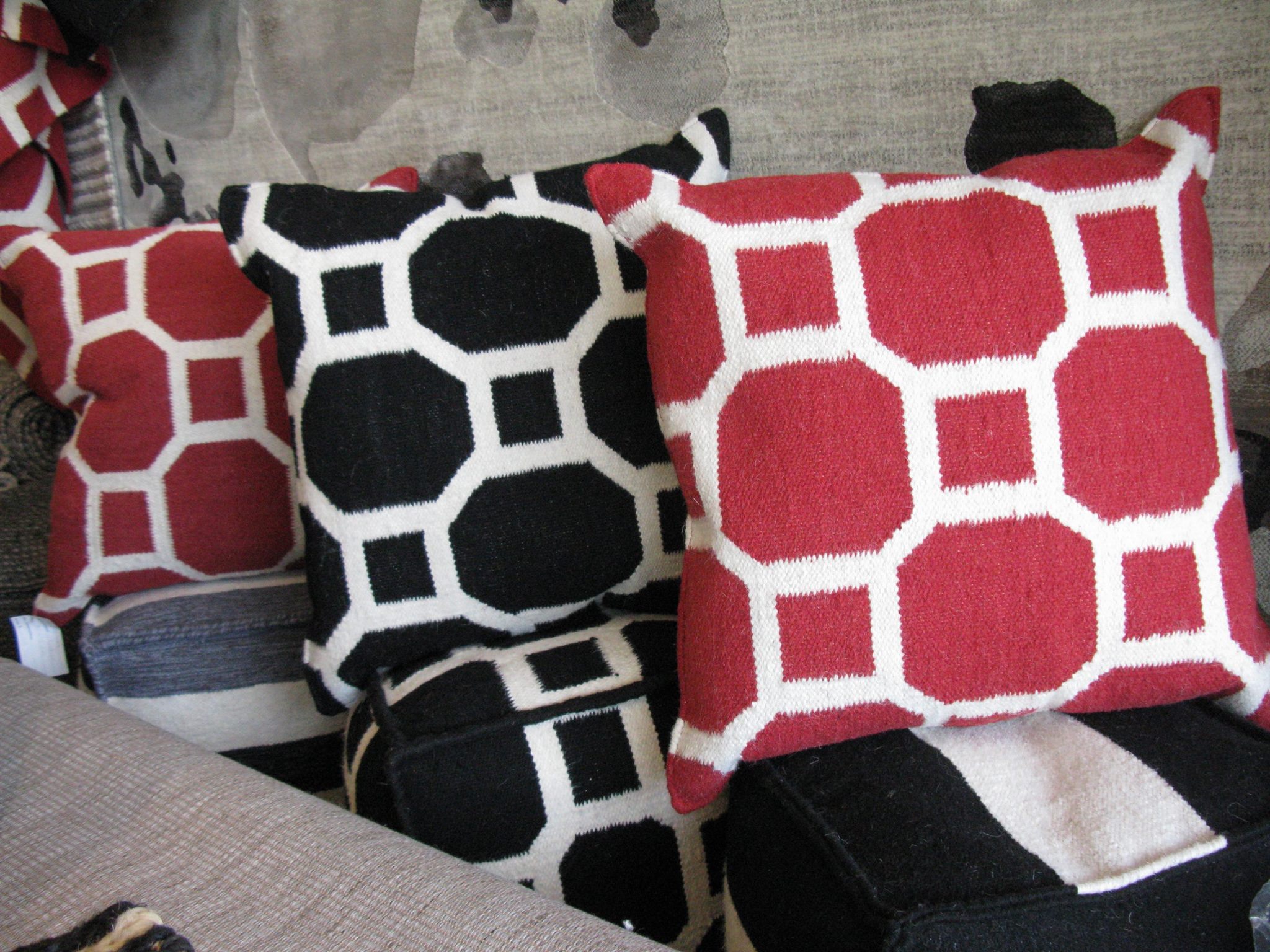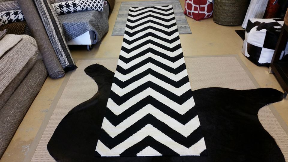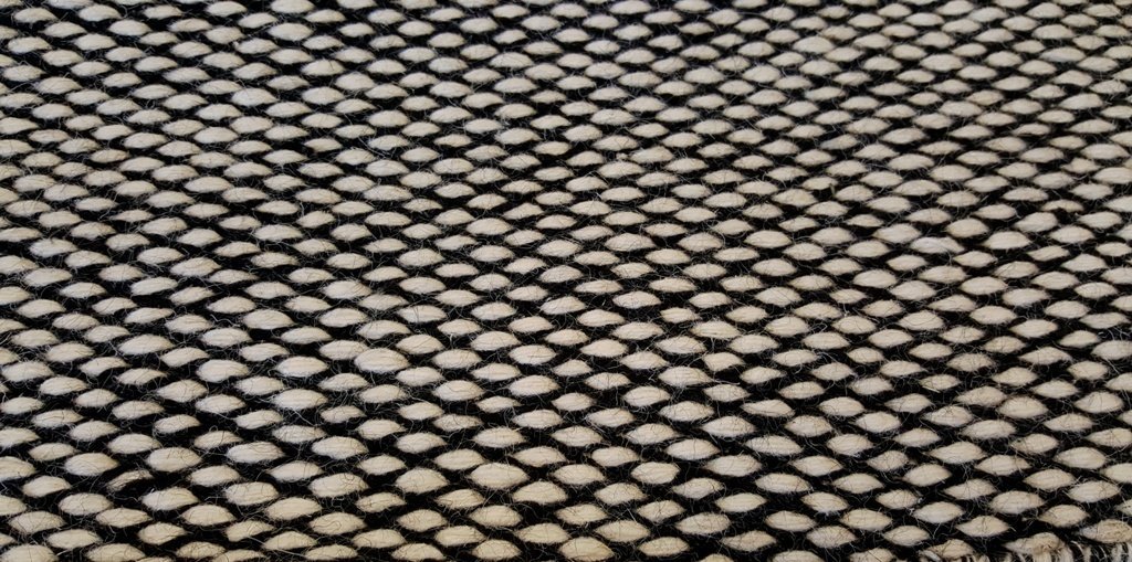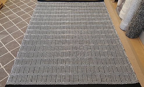 Traditional flat woven wool dhurrie with an art deco inspired geometric design of black and white colouring . Sized 160 x 220 cm or 110 x 160 cm. A traditional weave with a contemporary design.