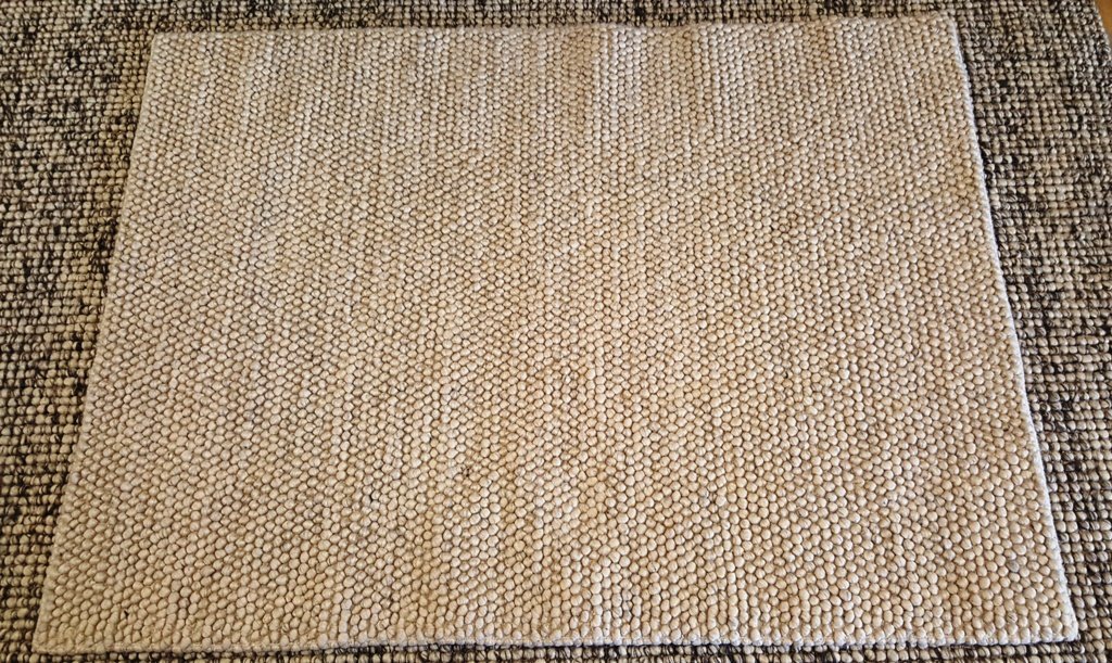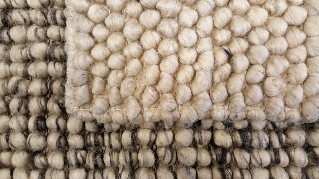 Artisan wool rug design Nirvana Snow. A contemporary flat woven wool rug with a deep, tight loop pile woven to give a pebble like texture. Nirvana Snow has a stunning flecked cream colouring.